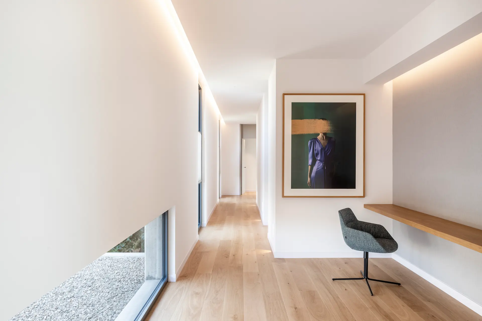 El diseño de Envy se inspira en nuestro estilo característico, marcado por una estructura horizontal y una integración armoniosa con el paisaje natural. El hormigón visto se utilizó como material principal, destacando tanto su funcionalidad estructural como su estética única. Uno de los principales retos fue mantener la calidez característica de un hogar trabajando con hormigón visto, un material que puede transmitir frialdad si no se ejecuta correctamente. Para ello, se abrieron espacios en la planta baja, conectando el interior con el exterior y utilizando lamas de madera estratégicamente que le aportan la calidez deseada.